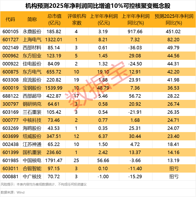 根据机构对上市公司全年盈利的预测,永鼎股份2025年净利润有望同比增长451.02%;上海电气全年净利润有望同比增长82.2%;西部材料(002149)、东方钽业(000962)、佳电股份(000922)、东方电气(600875)和应流股份全年净利润有望同比增长40%以上。另外,合锻智能(603011)、中广核技(000881)全年净利润有望实现扭亏为盈。